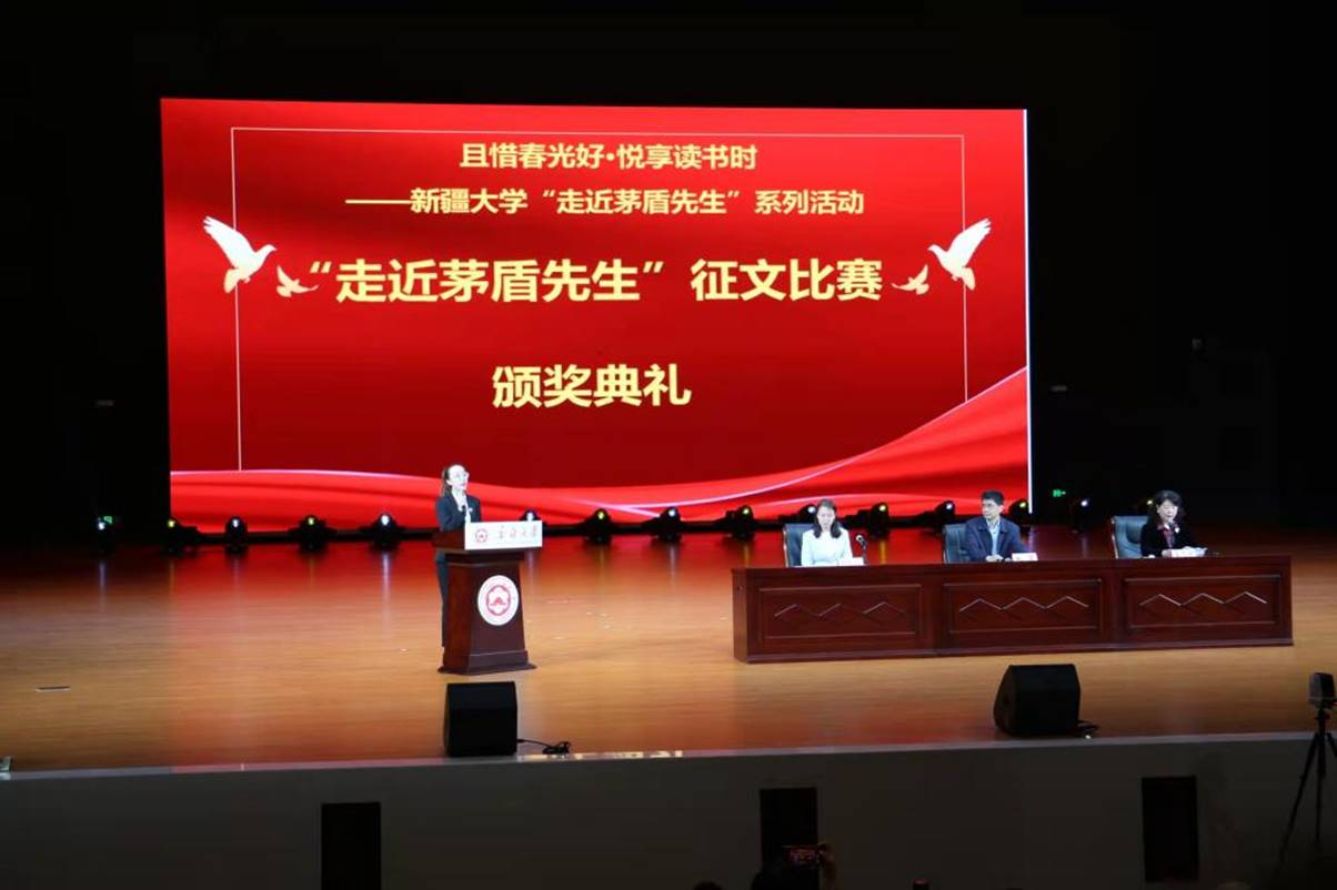 新疆大學(xué)黨委副書記孟凡麗教授主持頒獎儀式,新疆大學(xué)黨委常委、副校長祖力亞提·司馬義老師宣布獲獎名單。頒獎嘉賓為獲獎代表頒發(fā)獲獎證書及獎品。此次征文活動拉近了師生與茅盾先生的距離,通過認(rèn)真閱讀茅盾先生的著作,更加感受到茅盾先生為教育事業(yè)付出的心血與對祖國的熱忱之心。姚強(qiáng)校長為獲獎同學(xué)贈送了茅盾原著,并為每本贈書親筆撰寫了讀書寄語。