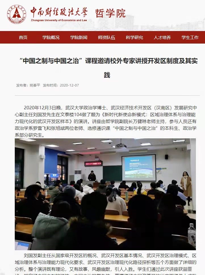 課程教學彌合嚴謹理論分析與時政要聞追蹤之間的分野,采用系列專家講座形式,邀請學有專長的學者以及來自政府部門的實務精英走進課堂。課程組設(shè)計了“中國能力——抗疫背后的中國之制與中國之治 ”“治大國:中國共產(chǎn)黨的治理之道”“中西文化比較視野中的中國之制”“中西文化比較視野中的中國之治”“中國語境下的公共治理方式及其有效性”“大國政治與大國外交”等多個富有特色的教學專題;并邀請武漢經(jīng)濟技術(shù)開發(fā)區(qū)(漢南區(qū))發(fā)展研究中心副主任劉國發(fā)、武漢市城管執(zhí)法督察總隊副總隊長鄭衛(wèi)星分別以《新時代新使命新模式:區(qū)域治理體系與治理能力現(xiàn)代化的武漢開發(fā)區(qū)樣本》、《城管執(zhí)法:尺度拿捏的藝術(shù)》為題從基層工作視角向?qū)W生講述中國之治的真實故事,展現(xiàn)中國之制的制度優(yōu)勢和中國之治的實踐智慧,引導學生理解中國特色社會主義制度優(yōu)勢轉(zhuǎn)化為國家治理效能的機制和邏輯。