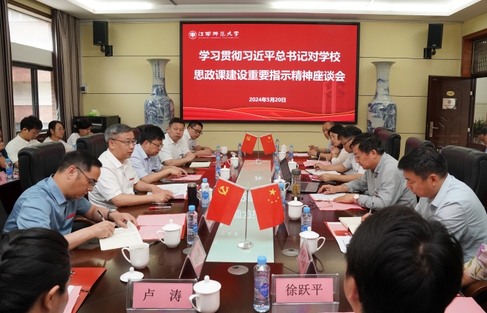 5月20日下午,江西師范大學(xué)學(xué)習(xí)貫徹習(xí)近平總書記對(duì)學(xué)校思政課建設(shè)重要指示精神座談會(huì)在馬克思主義學(xué)院2317會(huì)議室召開。會(huì)議傳達(dá)習(xí)近平總書記對(duì)學(xué)校思政課建設(shè)重要指示精神和新時(shí)代學(xué)校思政課建設(shè)推進(jìn)會(huì)精神,并對(duì)學(xué)校思政課建設(shè)作出部署。校黨委書記黃加文,校黨委副書記汪洋,校黨委常委、副校長(zhǎng)鐘業(yè)喜出席。相關(guān)學(xué)院、職能部門主要負(fù)責(zé)人,思政課教師代表、學(xué)生代表代表參加。汪洋主持會(huì)議。